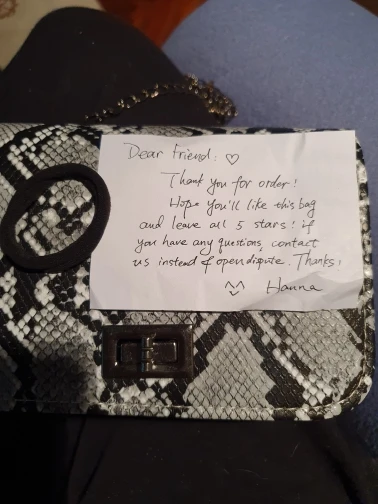 Beautiful handbag as in the picture, the seller put a note inside with gratitude as well in a gift of a hair elastic band, a trifle, but so nice)